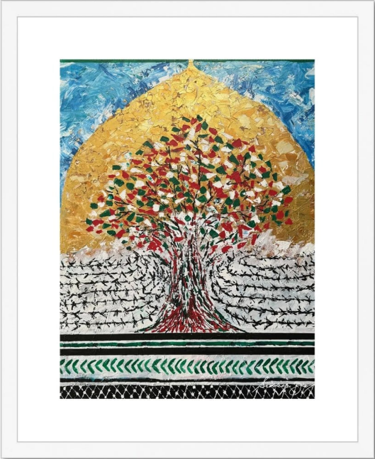 “Sumud” is a poignant depiction of Palestinian resilience and steadfastness amidst adversity. The painting captures the essence of the Palestinian struggle, portraying a landscape scarred by conflict yet infused with hope. It conveys the unwavering determination of the Palestinian people to endure and thrive in the face of oppression. “Sumud” serves as a powerful reminder of the resilience and perseverance ingrained in Palestinian culture and history.